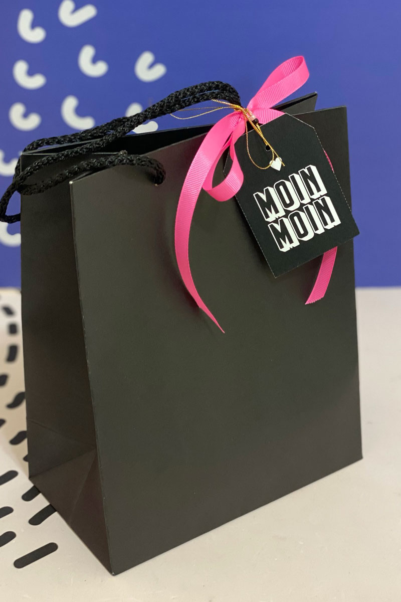 Bolsa de papel couche con asas de macrame agujeta 30×40 cm color negro personalizable