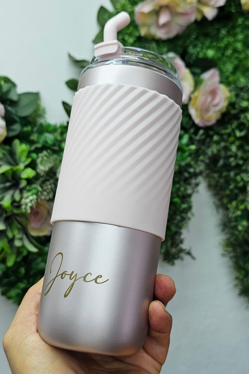Termo metálico personalizado con sistema de popote y agarre ergonómico, diseñado para facilitar el consumo de bebidas en movimiento mientras mantiene la visibilidad de marca.