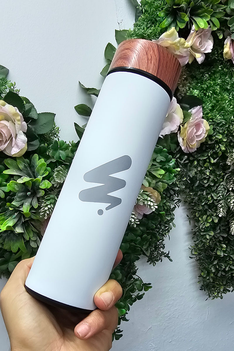 Cilindro metálico de color blanco con tapa rosca, personalizado en serigrafía capacidad 500 ml