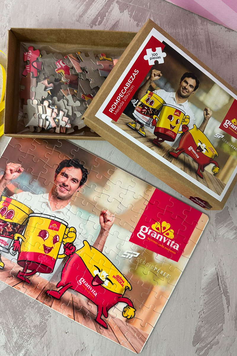 Kit de regalo personalizado en caja prediseñada kraft, cierre tradicional con suaje. Incluye tag y moño con listón personalizado. Contiene 1 rompecabezas personalizado desarrollados especialmente para este kit.