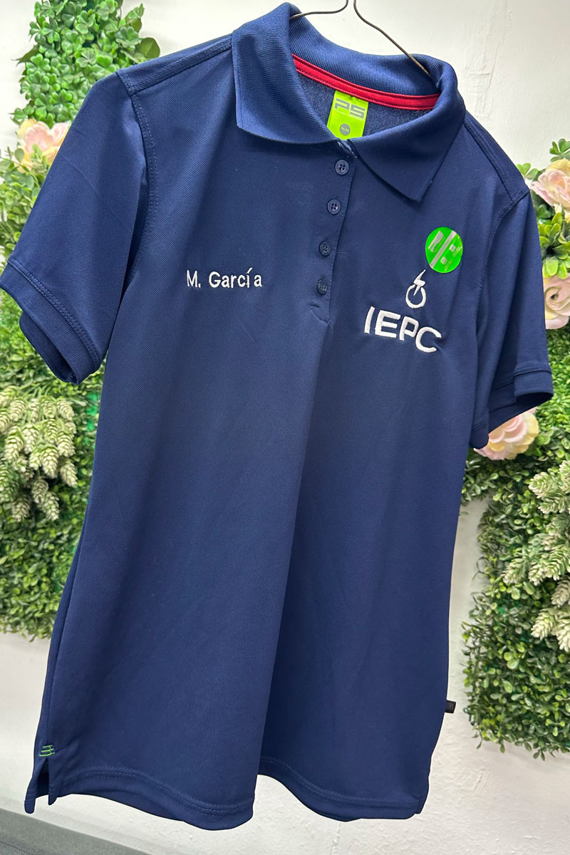 Playera Polo dryfit azul imagen frontal, mangas y parte trasera, personalizable en bordado, DTF, vinil textil y serigrafía.