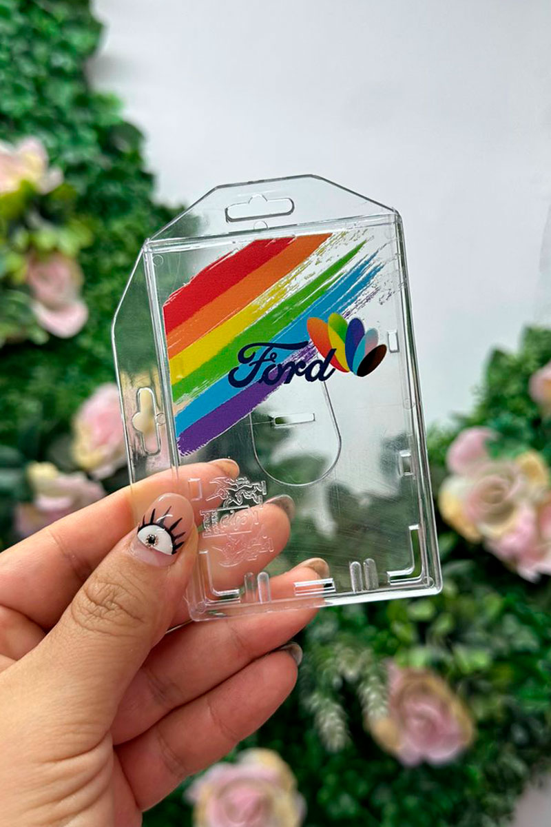 Portagafette de plástico rigído transparente de 5x7cm con abertura superior personalizable en dtf, serigrafía o sublimación apto para cordones, cadenas y clips